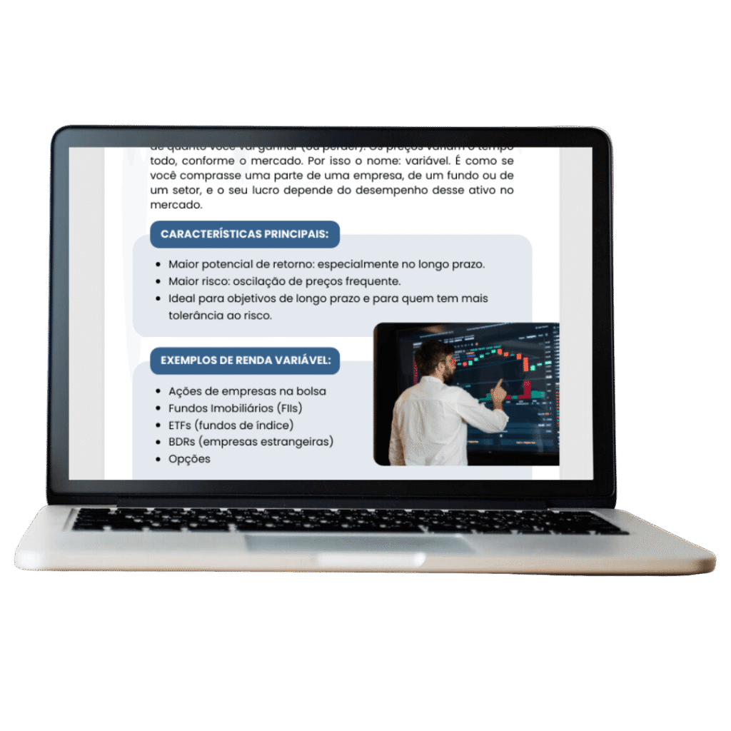 Você vai entender os principais tipos de investimento (renda fixa, tesouro, CDB, etc.), saber qual combina com seu perfil e com o valor que você pode começar..